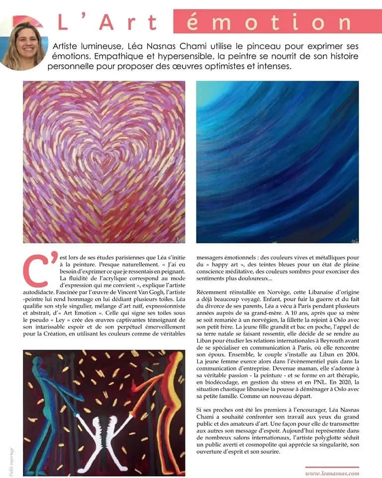 Léa is a Norwegian visual artist, originally from Lebanon. She recently settled back in Oslo with her family and paints in a particular style that she calls "emotion art" as she paints to express her great sensitivity. She loves to inspire and help others release suppressed emotions too. She has taken part in Oslo Kulturnatt and many major international art fairs such as Caroussel du Louvre in Paris, Art Expo New York, Art Connects Women in Dubai, and has collectors all around the world.